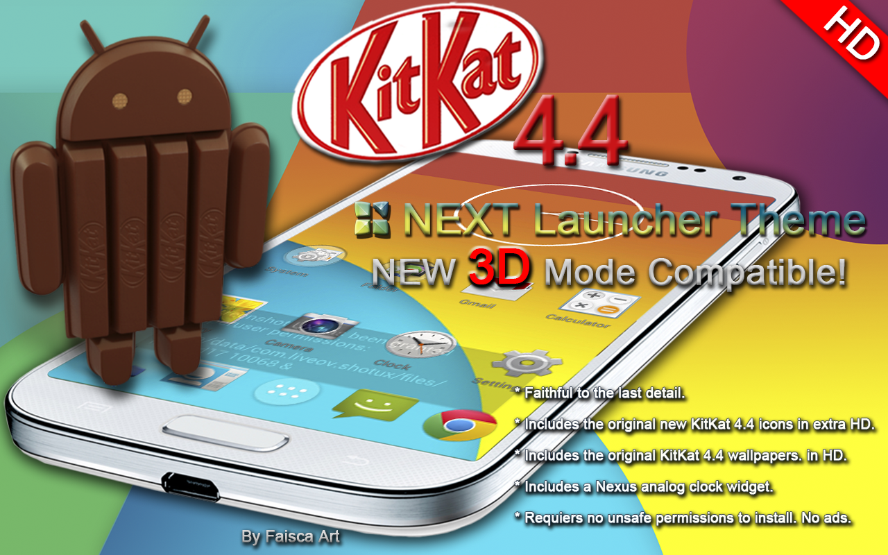 KitKat 4.4 Premium 3D Next Launcher Theme made wiith high quality graphics including latest KitKat 4.4 icons, the original HD wallpapers, and a clock widget, to give very detailed and defined graphics no matter your device's resolution.